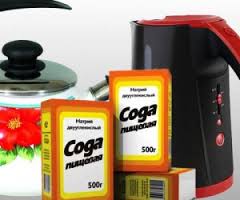 - наповнюємо чайник водою до максимальної позначки і всипаємо питну соду з розрахунку 3 ст. ложки на літр води;