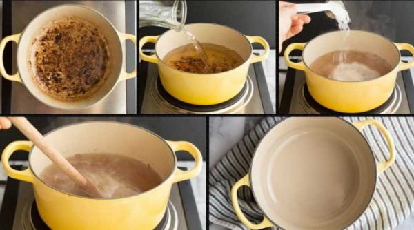 Перше, що потрібно зробити в домашніх умовах, якщо емаль пригоріла – це посуд залити водою. Але необхідно стежити, щоб температура води була відповідною, так як це покриття не любить різких перепадів температури. Коли нагар трохи розм’якшиться, його знімають губкою. Якщо ж такий спосіб очищення не допоможе, і зсередини каструлька все одно буде брудною, то доведеться використовувати більш ефективні методи.
