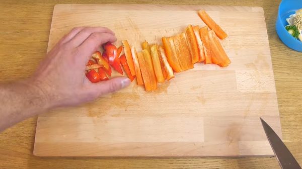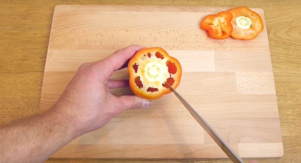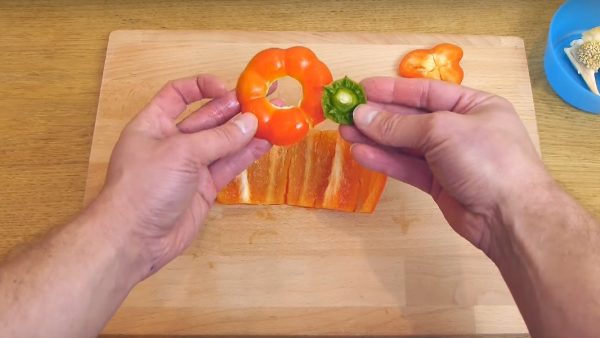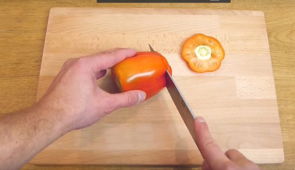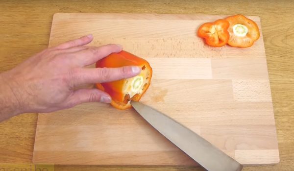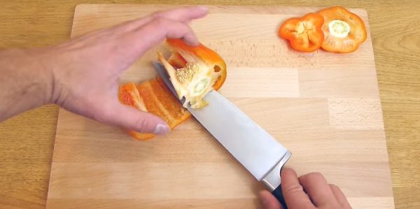 Цей варіант підходить, якщо вам не важлива цілісність перцю. Потрібно просто покласти перець на обробну дошку і гострим ножем відрізати від нього невеликі частини, не зачіпаючи плодоніжки.