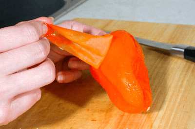 Після приготування перців на антипригарній сковороді або на решітці для барбекю їх слід перекласти в ємність, що герметично закривши кришкою. Пар допоможе відокремити шкірку від м’якоті. Після десяти хвилин акуратно зніміть шкірку.