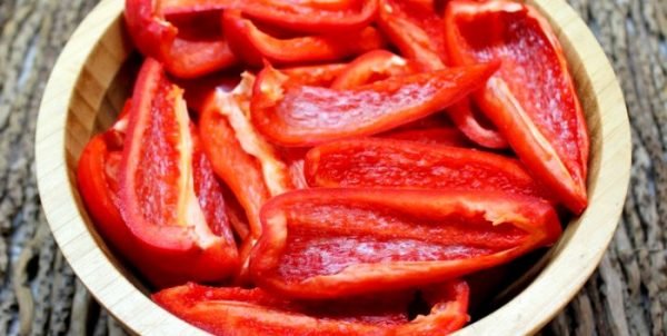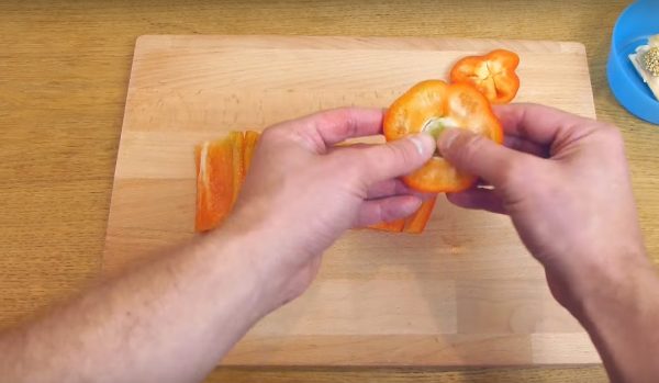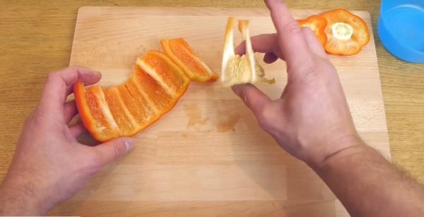 В результаті у вас залишаться частини перцю без білих волокон і плодоніжка з насінням. Перець промийте під проточною водою, щоб прибрати залишки на часточках насіння.