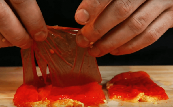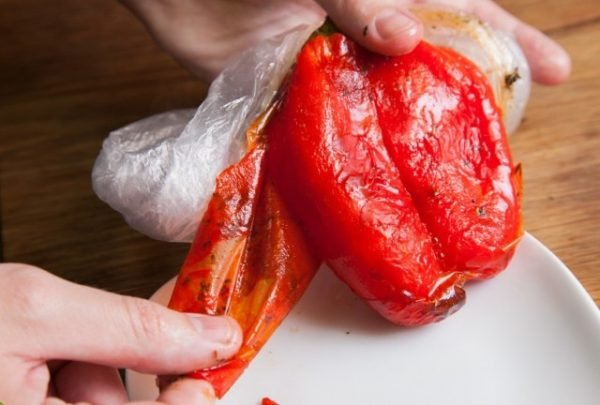 Після цього покладіть перець у глибоку тарілку і оберніть її харчовою плівкою, щоб в ємність не потрапляло повітря. Почекайте кілька хвилин, щоб шкірка відокремилася від овоча. Очистіть перець. Якщо шкірка не знімається великими шматками, то використовуйте невеликий ножичок і просто відскребіть її. Щоб не бруднити зайву посуд, перець можна помістити у звичайний кульок або обернути фольгою.