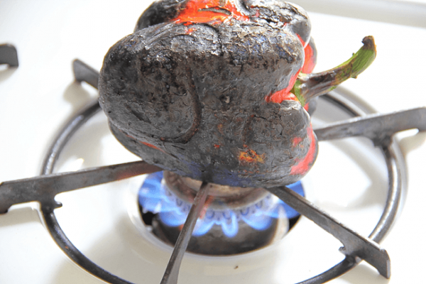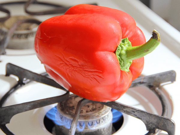 Покладіть перець на конфорку, як на фото вище. Якщо у вас є кулінарні щипці, то краще утримувати перець ними. Суть в тому, що потрібно рівномірно обпалити перець з усіх боків на сильному вогні. За час теплової обробки овоч навіть не почне готуватися, так що всі вітаміни залишаться в цілості.