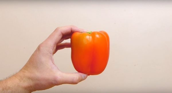 Добре вимийте і витріть перець. Візьміть його однією рукою так, щоб ніжка виявилася зверху. Пальцями іншої руки обхопіть ніжку біля самої основи і різко надавіть великим пальцем, щоб продавити її всередину перцю. Поверніть перець на пів-обороту і повторіть маніпуляцію. Отже, ніжка перцю опинилася всередині овоча. Тепер потрібно акуратно витягти її назовні разом з насінням. Після цього промийте овоч проточною водою, щоб позбутися від насіння, що залишилися всередині.