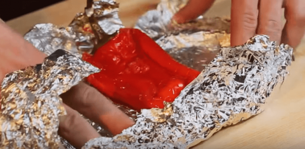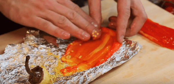 Щоб запекти перчик так, його потрібно загорнути у фольгу, не розрізаючи, і помістити в духовку, попередньо розігріту до 250 градусів. Почекайте півгодини, поки він приготується. Дістаньте з духовки і почекайте, поки він трохи охолоне.