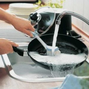 Як тільки ви закінчите готувати, зніміть жир з посуду. Врахуйте, що нагар – це не що інше, як застарілий жир. Якщо сковорідка нова, то цілком достатньо для миття звичайного гелю для посуду.