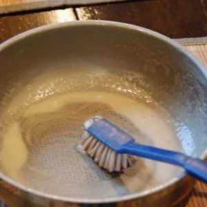 Вийшло миючий засіб виливають у сковорідку і ставлять на вогонь. Якщо є така можливість, то після кип’ятіння протягом 20 хвилин рідина залишають в посуді на добу. Вже на наступний день від бруду на поверхні начиння не залишиться і сліду. Весь нагар ви легко змиєте поролоновою губкою.