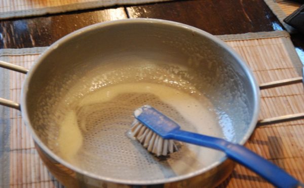 - Також в якості кислоти можуть виступати кефір, сироватка або розсіл від консервованих огірків/помідорів. Ці рідини наливаються в каструлю приблизно на 1 годину, після зливаються. Далі по металу слід пройтися м’якою губкою з звичайним засобом для посуду.