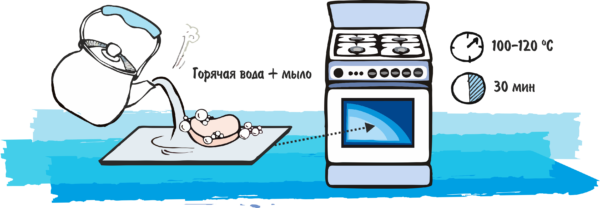 - відразу після активного користування духовою шафою, налийте в деко води з додаванням мийного засобу;