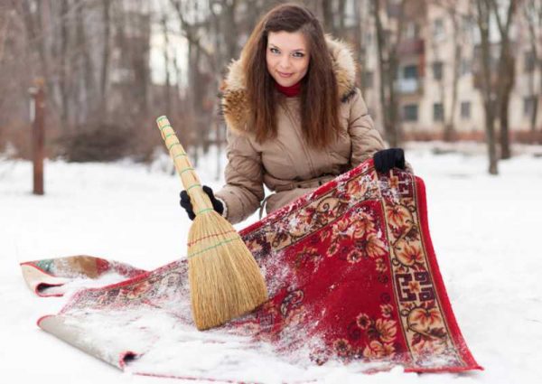- Для такого типу матеріалу самим ефективним буде застосування снігу. Для початку такий килим вибивають, а потім розстеляють на снігу, після чого на нього намітає сніг. Через третину години змітають сніг і накидають новий. Дія повторюють кілька разів. Цей спосіб позбавить ваше підлогове покриття не тільки від грязі, але і від пилових кліщів.