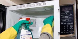 Воду в тарілочці ставлять в камеру і включають піч на 15 хвилин на максимальній потужності. Коли прилад відключиться, камеру не треба відкривати, щоб конденсат «попрацював» всередині, розм’якшуючи стійкі забруднення. Після цього тарілочку дістають, а камеру зсередини протирають ганчіркою.