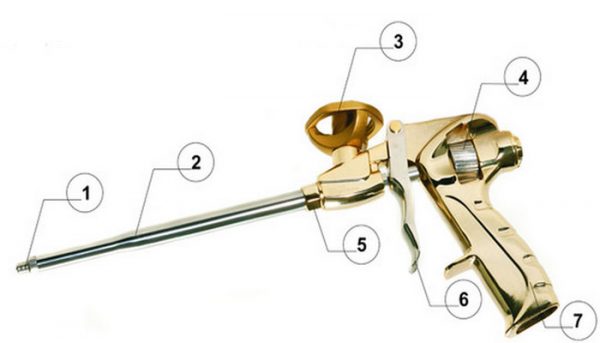 Пістолет для монтажної піни складається з: 1 – трубки, 2 — стовбура, 3 — адаптера, 4 — болта, 5 — кріпильної частини, 6 — курка, 7 — рукояті