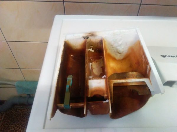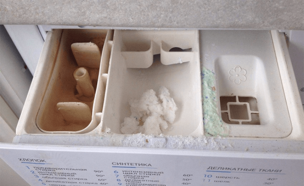 - Засоби для прання та кондиціонування білизни не змиваються повністю, їх залишки засмічують лоток і порожнину під ним. Особливо проблеми доставляє нерозбавлений концентрат кондиціонера.