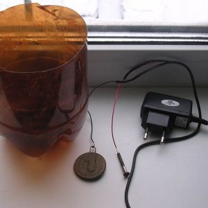 Можна приступати до дії. Вмикайте блок живлення і утримуйте проводу за ізоляцію і далеко один від одного, тому як їх зіткнення викличе коротке замикання. Опускаємо затискачі в рідину і спостерігаємо. Один з них виявиться плюсом. Зрозуміти це просто адже з нього буде рясно виділятися газ, і супроводжуватися шипінням. Саме плюс потрібно буде підключити до монетці, а мінус до чужорідного металевого тіла. Ця процедура проходить з вимкненим харчуванням.
