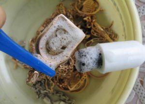 - Золоті прикраси з діамантами або фіанітами чистяться за допомогою нашатирного спирту або мильного розчину. Камені можна протерти щіткою.