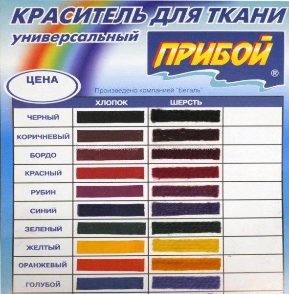 Добре відгукуються про порошковому барвнику «Прибій». Це універсальна фарба для тканини в домашніх умовах, підходяща для штучних і натуральних виробів (бавовна, капрон, шерсть і т. д.). Палітра включає десять кольорів. Один пакетик розрахований на фарбування 0,5 кг тканини. Це якщо вибирати з більш дешевих варіантів.