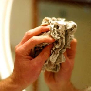 Після цього промити водою, в яку додати оцет, або кілька ложок спирту або горілки. Це допоможе дзеркалу засяяти. Всю вологу видалити сухою серветкою, яка добре вбирає рідину. Замість серветки, витерти поверхню дзеркала грудкою з газети або паперовим рушником, які добре вбирають вологу. Витираючи дзеркало, можна почути скрип, який показує, що дзеркало чисто.