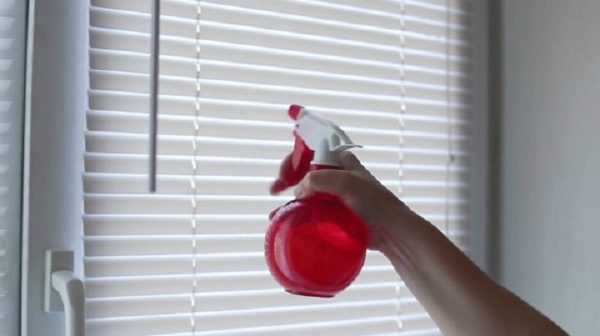 - Рідина для миття вікон підійде і для очищення жалюзі. Інструкція по застосуванню та ж: ламелі переводяться в закрите положення, обприскуються складом, а потім по черзі протираються сухою тканиною.