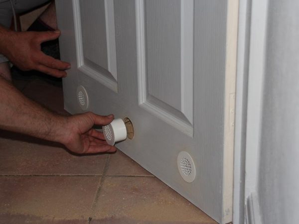 Для кращої циркуляції повітря, в нижній частині дверей випилюється отвір і вставляється решітка. Так ви забезпечите приплив повітря в приміщення.