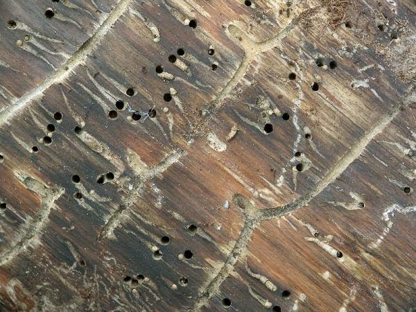 Невеликі отвори на колоді або дошці свідчать про давнє проживанні жуків-короїдів