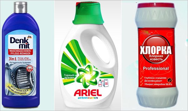 Попередній спосіб можна поєднати з дезінфекцією. Для цього підійдуть спеціальні розчини, які продаються у магазинах побутової хімії. Дбайливі господині рекомендують не витрачатися на подібні продукти і використовувати відбілювач з хлором або спеціальні таблетки для посудомийних машин. Розрахунок кількості цих коштів йде по інструкції: на одне прання постільної або на один цикл миття посуду.