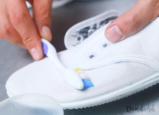 Видалити жовті плями з тканини кросівок можна за допомогою зубної пасти та щітки. Спочатку потрібно злегка зволожити поверхню взуття. Потім слід нанести трохи пасти на щітку або щільну губку і гарненько потерти нею проблемні ділянки на взуття. В такому стані кросівки потрібно залишити десь на півгодини, після чого пасту можна змити, а саму взуття – ретельно прополоскати і висушити.