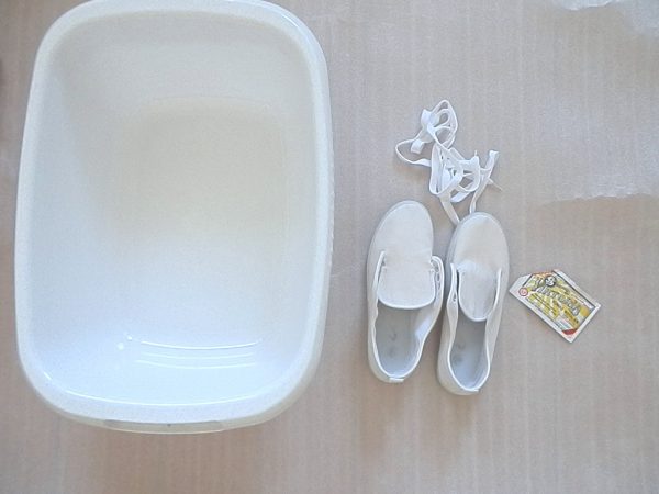 Попередньо жорсткою щіткою зчищають налиплу і присохлу бруд з взуття. Можна промити під водою підошву, щоб видалити залишки піску чи глини. Пам’ятаємо, що кольорові речі не стираємо з білими. І відбілювач для колорированной взуття краще не використовувати.