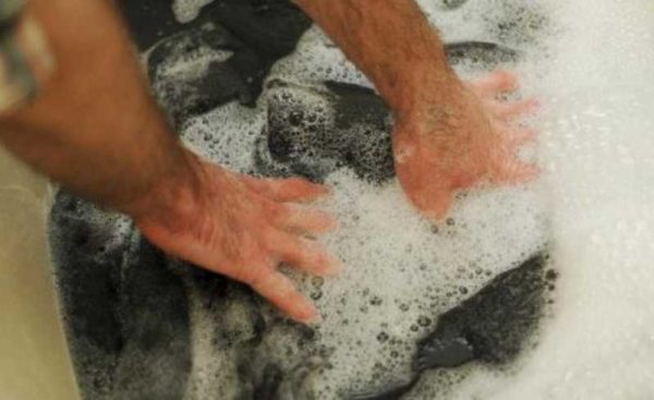 Простирывают такі речі дуже дбайливо, намагаючись матеріал не розтягувати в різні боки. Цілком досить протерти мильним розчином шкіру з зовнішньої сторони з допомогою поролонової губки.