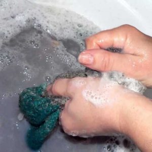 У воду додається миючий для вовняної нитки. Якщо такого засобу немає, то можна використовувати навіть звичайний шампунь – цілком згодиться дитячий. Якщо ви будете використовувати звичайний пральний порошок, то, перед тим як занурюйте прилад у воду, переконайтесь, що він добре розчинився. Справа в тому, що гранули порошку, які не розчиняться, осядуть на трикотажі, і виріб потім буде неприємно пахнути.