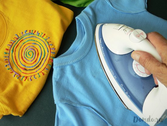 А ось всілякі намистинки і стрази потрібно прасувати з використанням вкрай низької температури, попередньо вивернувши футболку навиворіт. Лицьову сторону можна лише злегка відпарити праскою, не торкаючись при цьому самої тканини.
