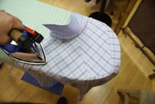 Великий обсяг роботи (2/3 тканини), що вимагає мінімальних навичок. Починати рекомендуємо з передньої половини без гудзиків. Укладаємо її гудзиками від себе, повністю пропрасовуємо. Потім розкладаємо задню частину на дошці, перетягуючи вже поглаженное половину далі.