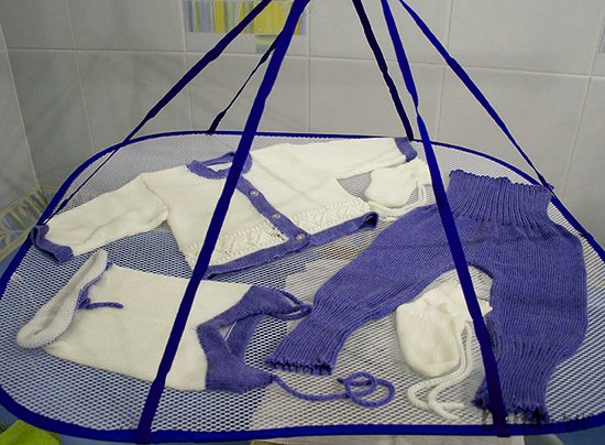 Пряжа швидко вбирає воду у великому обсязі, вологі в’язані вироби значно важче речей з інших матеріалів. Щоб одяг не розтяглася під власною вагою, сушити її рекомендується в розправленому вигляді на горизонтальних площинах. При цьому під речі варто підкладати тканину, яка добре вбирає вологу. Під час сушіння в’язані речі треба періодично перевертати та змінювати підкладковий матеріал по мірі його зволоження. Сушити у вертикальному положенні можна вироби легкі вироби невеликого розміру, використовуючи для цього плічка і вішалки.