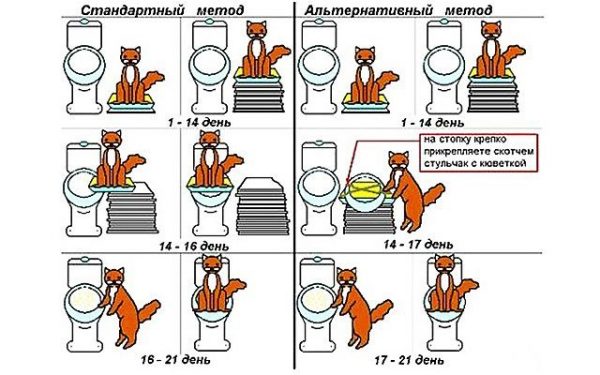 Щоб привчити кошеня або дорослу кішку користуватися унітазом, треба поруч, впритул з ним розмістити котячий лоток з наповнювачем. Поступово підкладаючи журнали під лоток, піднімаючи його на висоту сидіння унітазу. В той же час не забуваємо міняти наповнювач на чистий, а тварина продовжує справляти нужду в лоток. Поступово зрушуємо лоток спочатку на 1/3 частину унітазу, потім на Ѕ частину унітазу, потім на весь унітаз. При цьому не забуваємо закріпити лоток скотчем для стійкості. Кошеня поступово звикає до запахів, місцем, висоті.