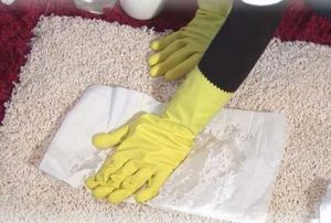 роботу потрібно проводити в рукавичках. Також потрібно враховувати, що хлорка дуже шкідлива, тому потрібно дуже ретельно промити килим після обробки. Найкращим варіантом буде просушити його на свіжому повітрі.