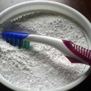 На гарячій сковороді розігрійте порошок. Потім дії прості – на вичищену поверхню насипаєте зубний порошок і забираєте щіткою забруднення. Можна до гарячого порошку притиснути серветку, щоб жир краще вбрався. В кінці жорсткою щіткою чиститься взуття від порошку.