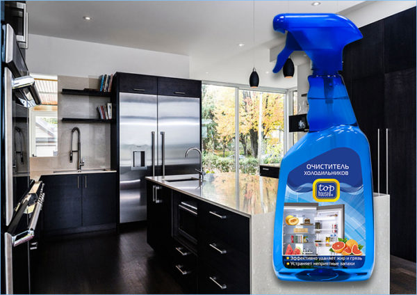 - Застосування спеціальної побутової хімії. Незважаючи на ефективність такого способу, є у неї великий недолік. Все-таки хімічні речовини для прибирання місця, в якому зберігається їжа, варто використовувати виключно в крайніх випадках. Та й ціна на подібні препарати може сильно вразити вас.