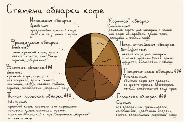 Ступінь обжарювання може бути світлою (слабкою), що універсальної (середній) і сильною. Інформацію про це можна знайти на упаковці, де цифрами від 1 до 5 зазначено, наскільки кави «засмаглий».