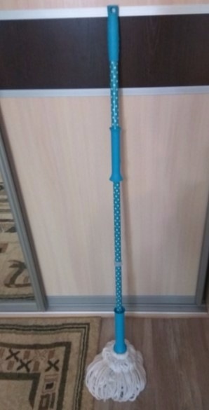 Досить довга палиця з круглим підставою на кінці, де закріплено безліч мотузочок. Моп мотузковий буває двох видів: бавовняні нитки з додаванням синтетичного поліестеру; смужки з мікрофібри. Мені більше по душі мікрофібра.