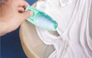- Якщо речі мають яскраве забарвлення, тоді можна скористатися сирим яєчним білком і гліцерином. Для цього у співвідношенні 1:1 змішують ці 2 кошти і наносять на проблемне місце. Після цього річ обполіскують спочатку в теплій, а потім в холодній воді.