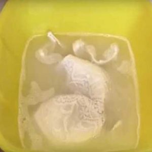 В емальовану каструлю наливають воду, додають харчову соду і зовсім трохи прального порошку. Потім виріб опускають в розчин і ставлять каструлю на вогонь. Кип’ятити потрібно не менше 30 хвилин. Після цього ліфчик полощуть у холодній воді.