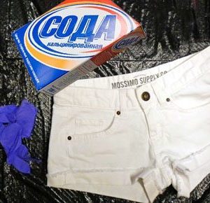 Прати джинси з харчовою содою слід вручну, оскільки сода дуже швидко зношує барабан пральної машини. Достатньо замочити річ в теплій воді, в якій попередньо потрібно розбавити харчову соду (3 чайні ложки соди на 1 літр води). Річ повинна знаходитись у розчині 3 години, після цього її потрібно випрати. З першої спроби джинси з допомогою соди не освітлити, тому доведеться повторити процедуру кілька разів.