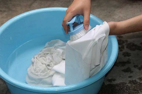 Необхідно взяти 10 літрів трохи теплої води і розвести в ній 4 ст. л. перекису. Туди ж додають 1 ст. л. нашатирю, 6 ст. л. солі і 50 г прального порошку. Перед тим як прати одяг, замочіть її в цьому розчині на 30 хвилин. Після замочування виріб полощеться і завантажується в пралку.