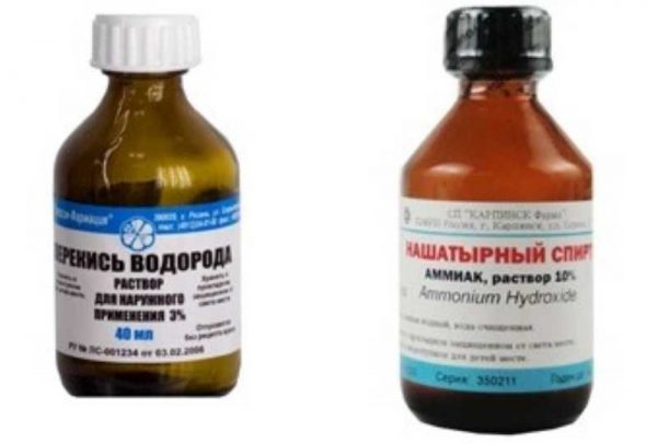 - Додайте у воду 2 ст. л. перекису і 1 ст. л. нашатирного спирту, перемішайте.