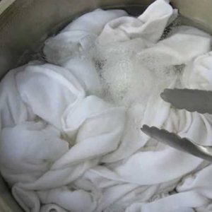 Потім наберіть в виварку воду, занурте в неї річ і ставте кип’ятити. Можна для досягнення кращого результату додати пральний порошок. Річ періодично помішують і кип’ятять 30 хвилин.