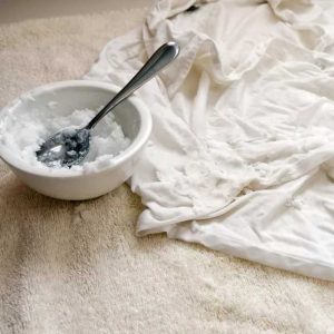 Тальком можна видалити тільки слабкі забруднення, але все ж цей варіант непоганий. Брудні ділянки замочують теплою водою, а потім густо посипають тальком. Порошок збере весь бруд з матеріалу. Залишиться тільки випрати виріб в порошку з відбілюючим ефектом.