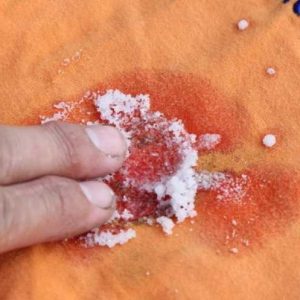 Помістіть одяг у таз і засипте забруднений ділянку товстим шаром солі. Можна ще відіпрати пляму від мандарина міцним соляним розчином. Свіжий сік чудово відпирається і кашкою з кухонної солі та води.