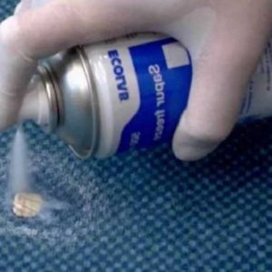 У магазинах продаються спеціальні спреї, щоб прибрати такі забруднення. Дія їх аналогічно заморожування речі в морозилці. Хоча можна скористатися і простим засобом для виведення плям.