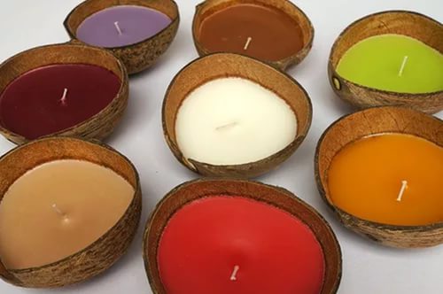 Декорувати свічки з кокосової шкаралупи можна штучними квітами, шпагатом або трубочками кориці з сушеним лимоном