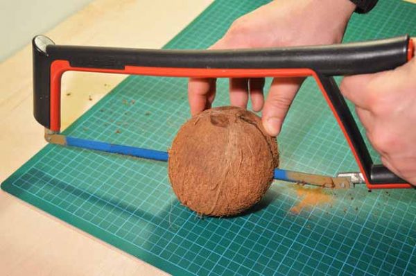 Пиляти кокос потрібно по його центральному шву: якщо уважно придивитися, то ми побачимо його між вічками. Маркером намічаємо лінію і распиливаем.