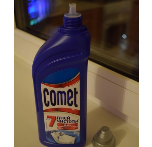 Ще одним дієвим засобом для очищення вікон від будівельних розчинів вважається густий Comet гель для сантехніки.